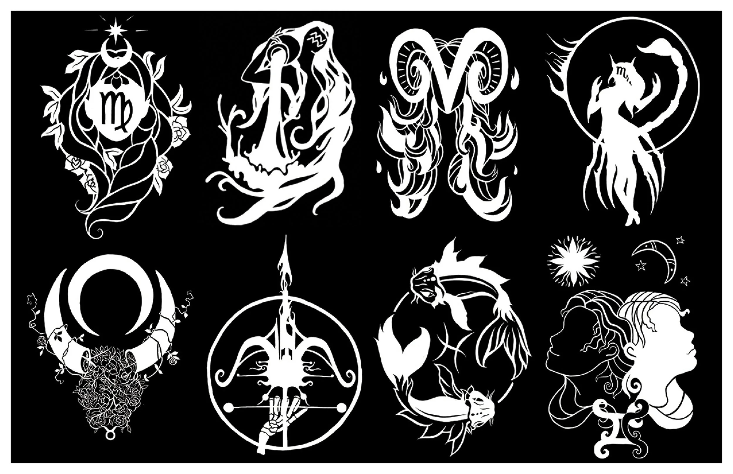 The first step included creating twelve digital illustrations, each one corresponding to each of the zodiac signs. From here I inverted and flipped the canvas horizontally and used this printed illustration as a stencil for my carvings.
